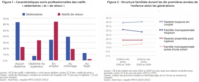 La Martinique est la région française où la part des natifs dans la population est la plus élevée. À l’inverse, la mobilité des natifs y demeure très importante, et s’est même légèrement accrue cette dernière décennie. En dix ans, la part des natifs qui se sont absentés durablement (plus de 6 mois) du département avant d’y revenir (les « natifs de retour ») a légèrement progressé (+ 3 points, de 32 % à 35 %), entrainant un recul de la part des « sédentaires » : ceux qui, à l’inverse, n’ont jamais de toute leur vie quitté leur île même pour un court séjour (- 2 points, de 13 % à 11 %). Les natifs de retour sont mieux insérés sur le marché du travail : 64 % des 25-64 ans «natifs de retour » sont en emploi contre seulement 34 % des « sédentaires » (figure1).